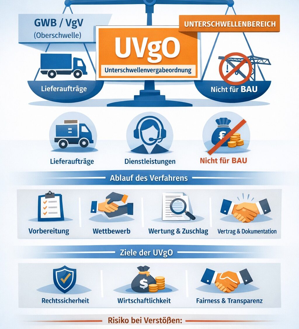 Die UVgO verpflichtet öffentliche Auftraggeber zur Vergabe eines Auftrags an den wirtschaftlichsten Bieter sowie zur Einhaltung des Wettbewerbs-, des Gleichbehandlungs- sowie des Transparenzgrundsatzes (vgl. § 97 Abs. 1, 2 GWB). Das macht die UVgO zu einer zentralen Verordnung im nationalen Vergaberecht.